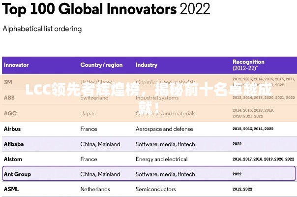 在當今競爭激烈的全球環境中,LCC(某種可能是指特定領域的縮寫,如某個大學、公司或競賽的簡稱)的排名前十名成為了人們關注的焦點,這些領先者以其卓越的成就、創新精神和持續的努力,為自己在行業內樹立了標桿,本文將深入探討LCC目前排名前十名的相關情況。